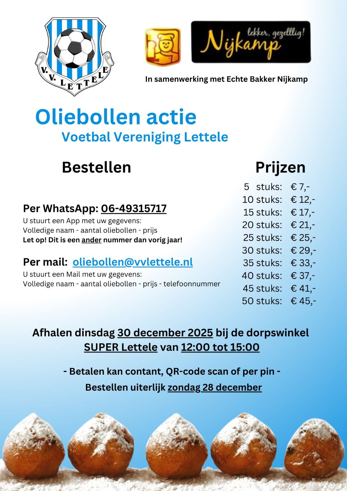 Ook dit jaar verzorgen een aantal spelers uit het 1e en 2e elftal de oliebollenactie van VV Lettele. De heerlijke oliebollen van bakkerij Nijkamp uit Holten kun je tot en met 28 december via WhatsApp of per e-mail bestellen, en op dinsdag 30 december ophalen bij Super Lettele van 12.00 tot 15.00 uur. Voor de prijzen van deze overheerlijke oliebollen: zie de bijgaande Flyer.
